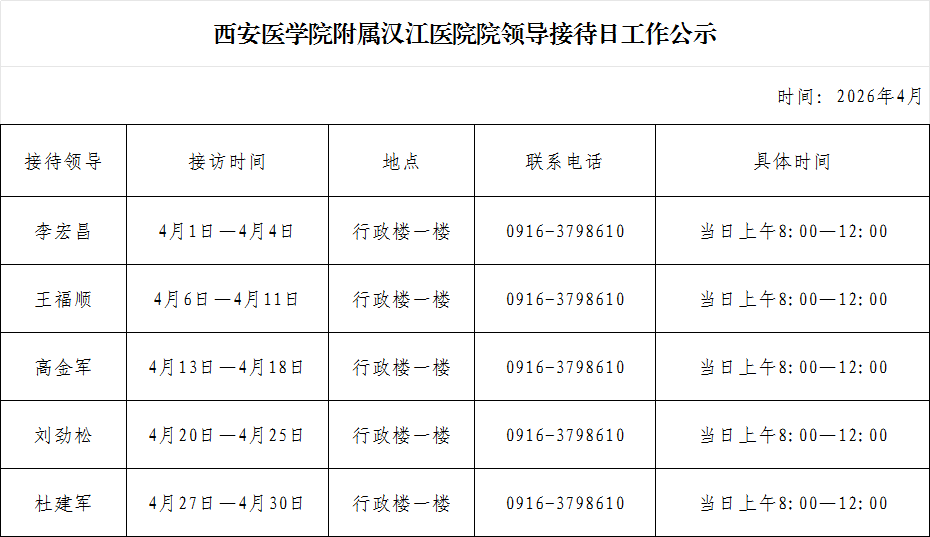 西安医学院附属汉江医院院领导接待日工作公示 4月