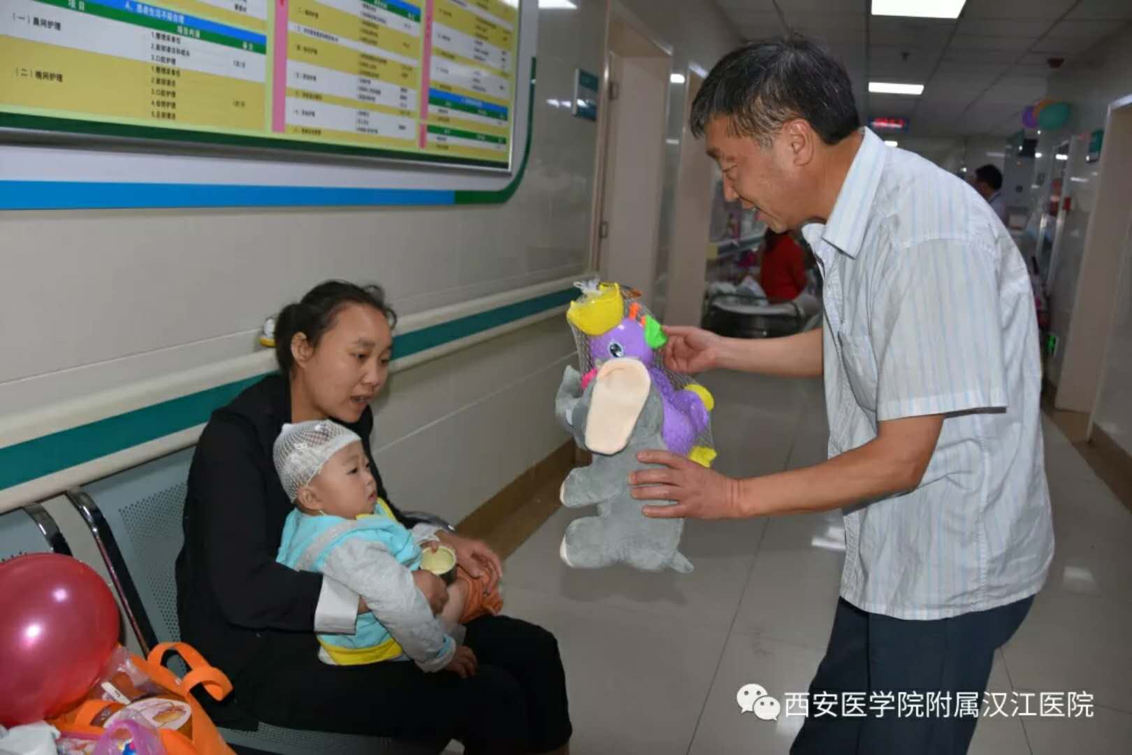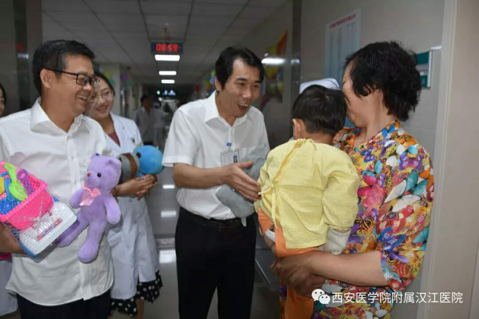 欧阳院长亲切的送上礼物,并祝小宝贝早日康复;刘书记为孩子精心挑选适合他的礼物,和蔼的说:“乖,听话,很快就能出院回家了”。何副院长握住小患儿的手耐心的让他挑选自己喜欢的礼物。