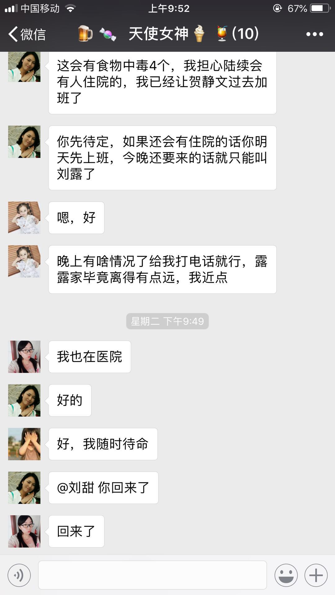 凭借以往的经验,我赶紧安排人手支援,以备后续再有食物中毒患者住院时,第一时间展开救治工作。结果我往科室群里一发消息,我们刘护士说,“好的,我随时待命”。房护士说,“晚上有事给我打电话就行,露露家毕竟有点远,我近点,随叫随到”。另一名刘护士说,“我也在医院”。而郑护士在看到医院工作群里发的消息时第一时间赶到科室默默无闻地开始加入救治工作……这样的情形我倍感欣慰,非常感动,遇到这样的突发事件我们所有人没有犹豫没有推脱,都积极主动的参与,不得不说我们的团队凝聚力非常强。这样的事件不计其数,就在去年冬天起我科病人剧增,护理人员不饱和的状态下,我们每人都是加班加点的工作,其中一位住在市区的资深护士,每次下班都是天黑了路灯亮了才开车回家,没一句怨言,甚至有的护士说,“加班使我感到快乐……”,多么朴实而简单的话语,却道出了我们对工作的态度和责任。对的,我们医疗这行,加班加点是常态,这也是我们的本职工作,没错,正是因为我们每个人有这样的信念才会使我们今天的工作干的得心应手,也正因为我们有这么一个团结有爱的团队,我们的工作才能有条不紊地进行。